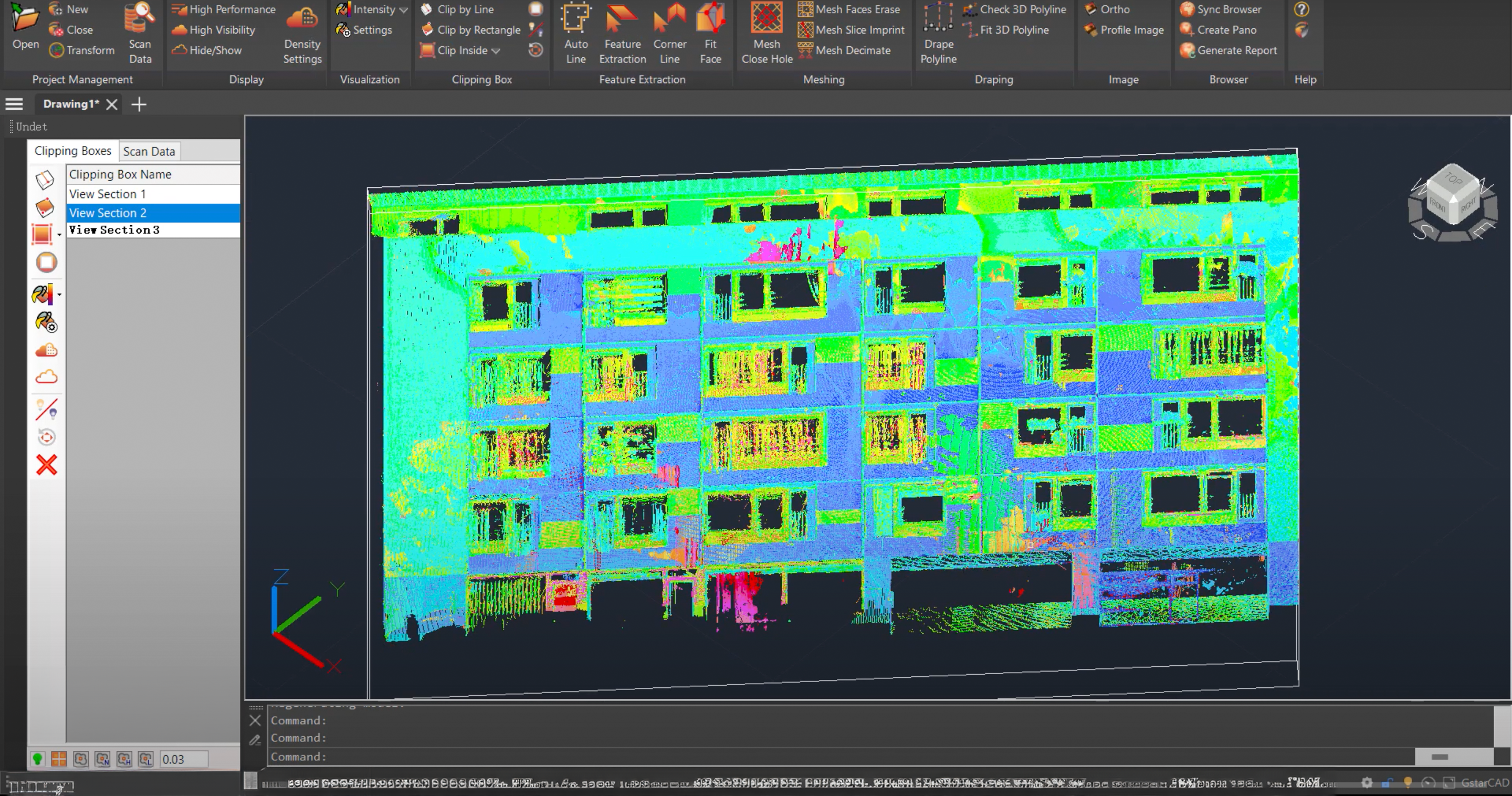 Instrumente de generare a imaginii în secțiune transversală de profil: Disponibil în vedere în plan, fără a schimba planul de desen și fără a roti proiecția vederii. - Mod de colorare inspectare model: utilizat pentru a verifica acuratețea unui model 3D și pentru a identifica detaliile lipsă cu vizualizarea în timp real a norilor de puncte în timpul modelării.