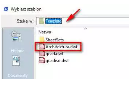 … gdzie w kolejnym oknie wybieramy podany wyżej plik Architektura.dwt a następnie zdefiniowany w nim Układ