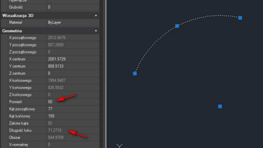 Następnie, po zaznaczeniu łuku, we Właściwościach (Ctrl+1) ustaw żądany PROMIEŃ np. 50.