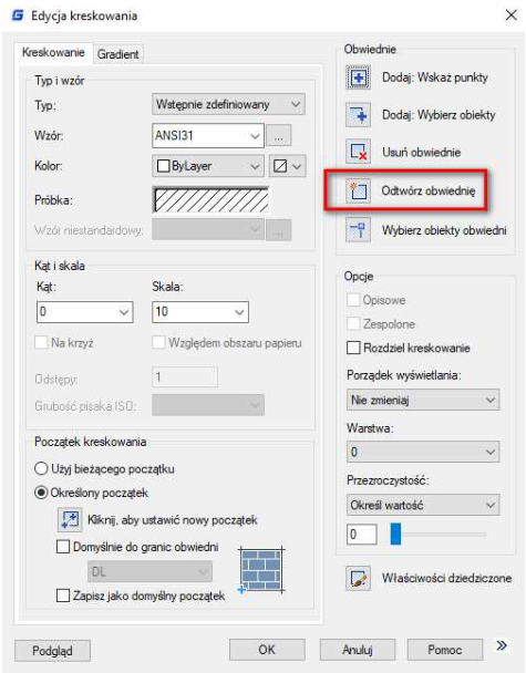 Wejdź w edycję kreskowania a następnie wybierz ikonę ODTWÓRZ OBWIEDNIĘ.