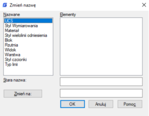 Okno to daje nam możliwość zmiany nazw: UCSów, , Stylom Wymiarowania, Materiałom, Stylom