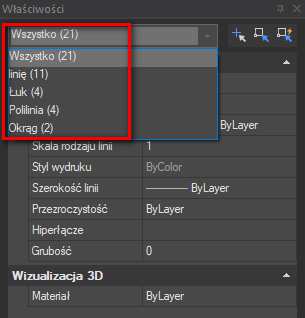 W oknie Właściwości (Ctrl+1) odczytasz ilości i rodzaj wybranych przez siebie obiektów.