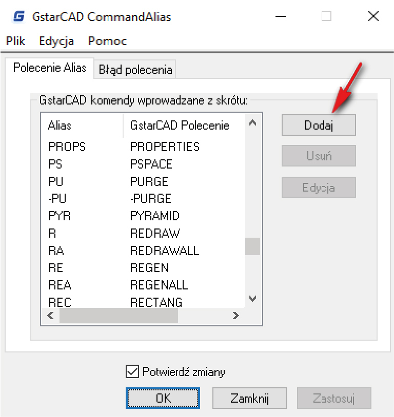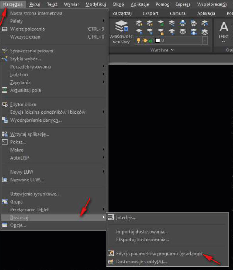 z której wybierz: Narzędzia / Dostosuj / Edycja parametrów programu (gcad.pgp)