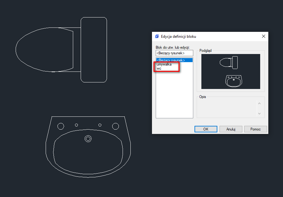 W przykładowym rysunku istnieją dwa bloki: umywalka i wc.