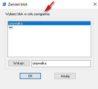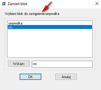 Po wybraniu ww ikony wskazujemy na liście blok w celu zastąpienia i po zatwierdzeniu przyciskiem OK …